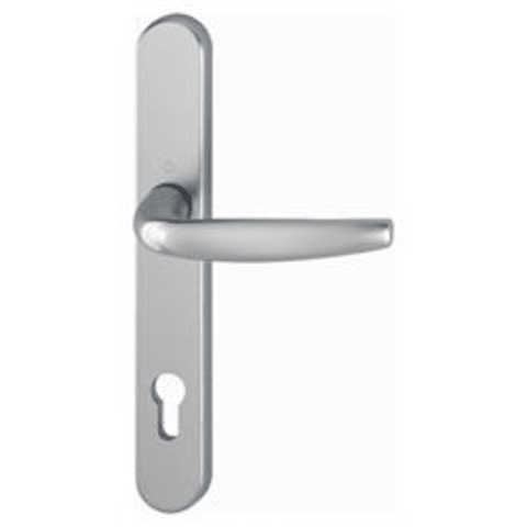 Profiltür-Langschild-Innenhalbgrt. Türgriff fest/drehbar gelagert mit Rückholfeder, HOPPE-Profilvollstift-Verbindung, Schilder mit Stütznocken, verdeckte Verschraubung.