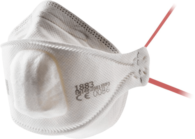 3M™ Faltmaske »Aura 1883+«Eigenschaften: • Atemschutzmaske mit abgedecktem mit 3M™ Cool Flow™ Ausatemventil: Atemwärme und Feuchtigkeit entweichen • Neu entwickeltes Filtervlies für geringen Atemw