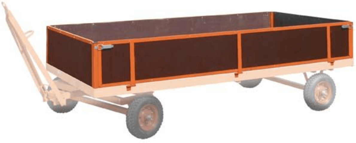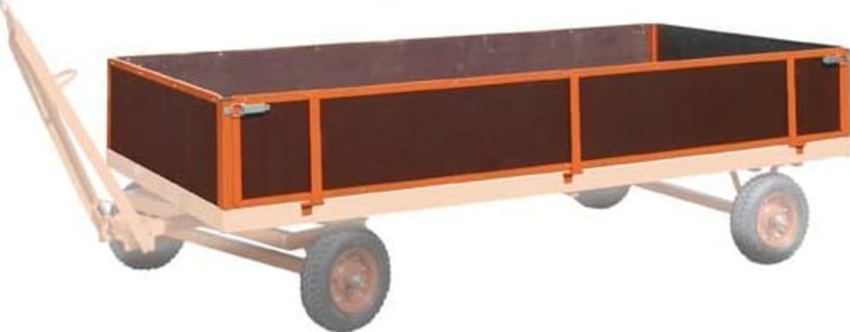 Aufbau für Industrieanhänger, 4 Bordwände • Stirnwände: feststehend, herausnehmbar • Seiten: 2 Stück abklappbar • Kastenverschlüsse: 4 Stück Hinweis: Die Preise beziehen sich ausschließlich auf die
