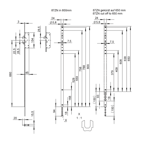 Stulplängen 500, 800 mm (Länge kürzbar um 150 mm)