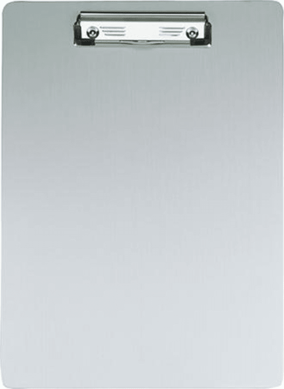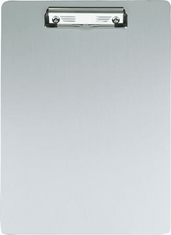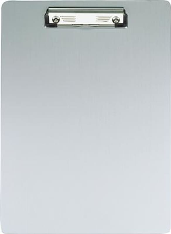 Schreibplatte, Alu, mit Bügelklemme • Material: Aluminium (eloxiert) mit abgerundeten Kanten • Bügelklemme mit großer Klemmweite (8 mm) • Format: DIN A4 • Farbe: alusilber • Recycelbar