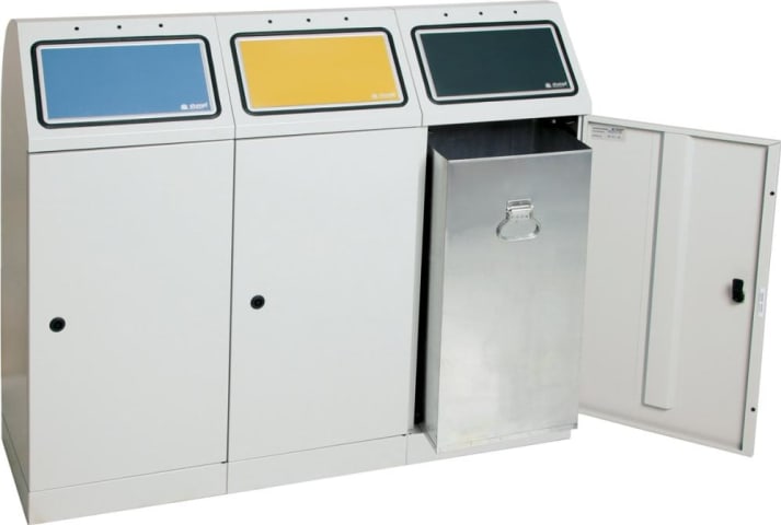 Wertstoffsammler, XXL-Einwurfklappe, mit Innenbehälter • Material: Stahlblech verzinkt • Oberfläche: pulverbeschichtet RAL 7035 lichtgrau • Schließung: Vierkantschloss, Schlüssel im Lieferumfang enthalten • Mit verzinktem Innenbehälter • Extragroße Einwurfklappe, selbstschließend mit Kantenschutz • Geruchshemmend • Entleerung: durch Öffnen der Tür Lieferung: Mit 1 Set ProPads©.