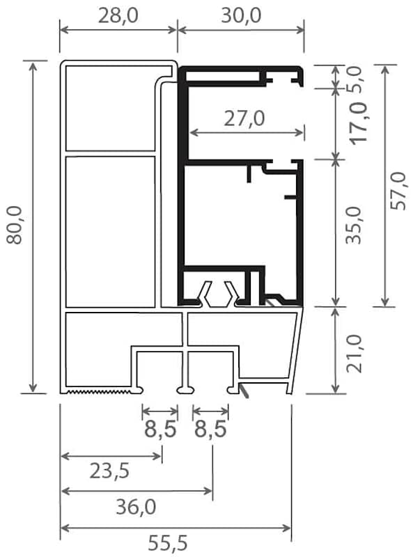 Adapterprofil 80x58 mm Lg. 6,00 m foliert, Revision außen & Rollladenführung 57x30 mm Lg. 6,00 m GK Grau, ohne Bürste 70 3905-167 QUARZGRAU [64]
