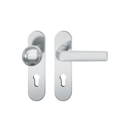FSB Wechselgarnitur 72 1267; Produkttyp: Wechselgarnitur; Produkttyp (Hersteller): Wechselgarnitur; Ausführung: Kurzschild; Befestigungsart: verdeckt verschraubt; Befestigungstechnik: mit Stütznocken; Form: oval; Vierkant: 8 mm; Material: Edelstahl; Form Türgriff (innen): L-Form; Form Türgriff (außen): Kugelknopf; Gewinde Knopf/Griffplatte: M12; Durchmesser Türgriff (außen): 50 mm; Breite Türgriff (innen): 23 mm; Länge Türgriff (innen): 135 mm; Höhe Türgriff (innen): 53 mm; Höhe Türgriff (außen): 66 mm; Schildbreite außen: 45 mm; Schildbreite innen: 45 mm; Schildlänge außen: 185 mm; Schildlänge innen: 185 mm; Schildstärke außen: 7 mm; Schildstärke innen: 7 mm; Lagerung: festdrehbar,mit Rückholfeder,Ausgleichslager® 3; Einsatzbereich: Zimmertür; Türart: Vollblatt; Türwerkstoff: Holz,Stahl; Norm: DIN EN 1906; Lochung: Profilzylinder gelocht; Entfernung: 72 mm; DIN-Richtung: DIN Links; Farbe: grau; Farbton: edelstahl; Oberfläche: fein matt; Design Türdrücker: Hartmut Weise; Ausführung Vierkant: Rollenwechselstift; Betätigungswinkel max.: 35 °; Türstärke min.: 39 mm; Türstärke max.: 48 mm