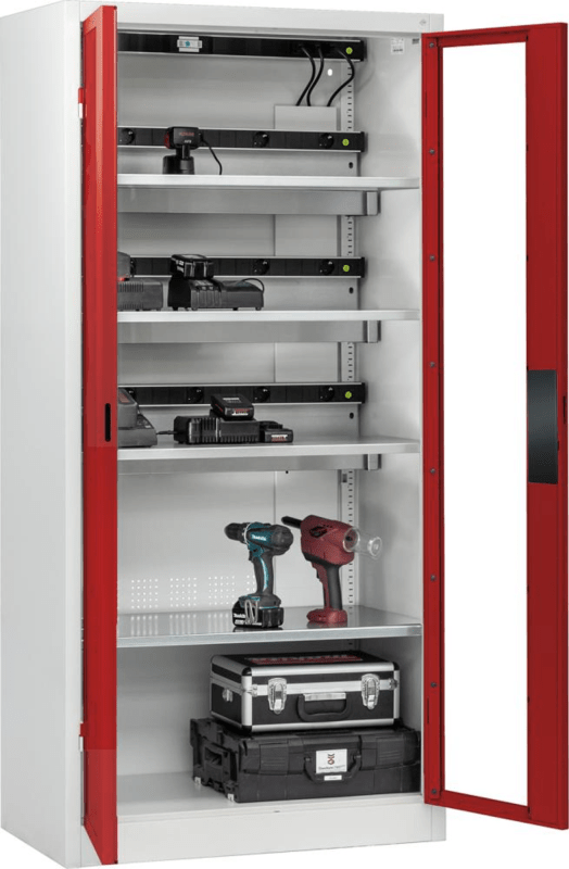 Akkuladeschrank COMFORT, mit Sichtfenstertüren • Stabile Stahlkonstruktion • Mit hochwertiger Einbrennbeschichtung • Türen: in außenliegenden Scharnieren, 180° Türöffnungswinkel • Sichtfenster aus Ac