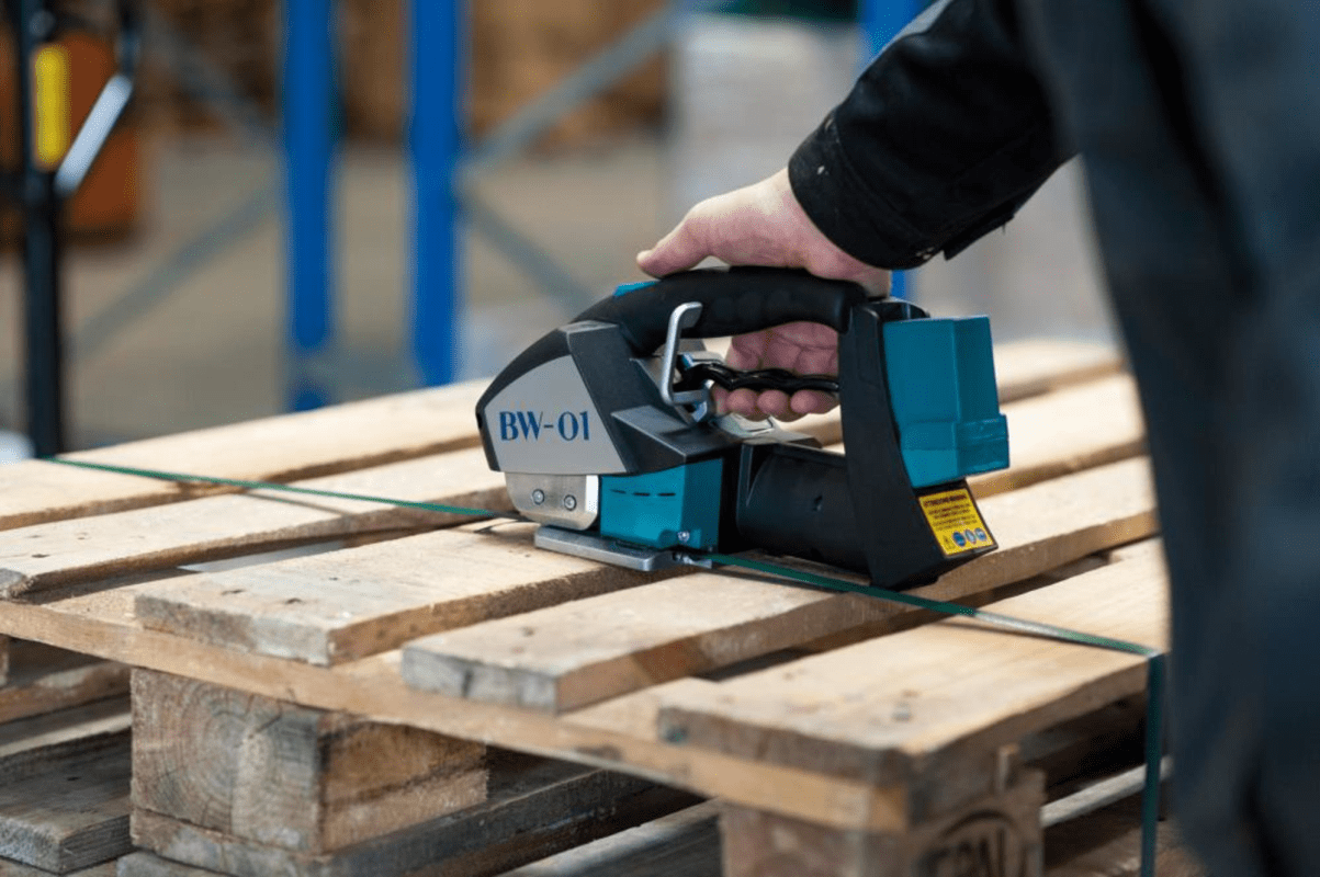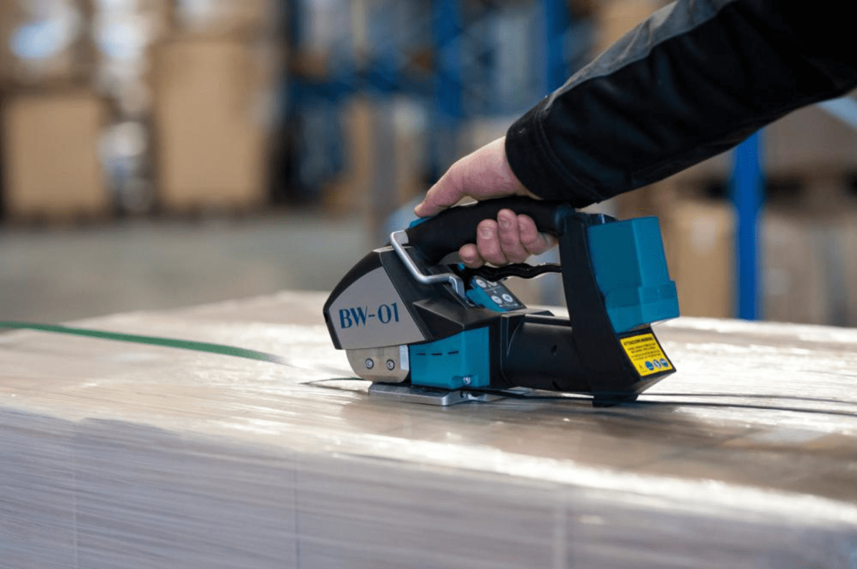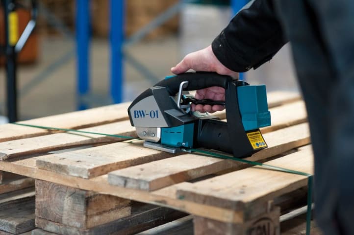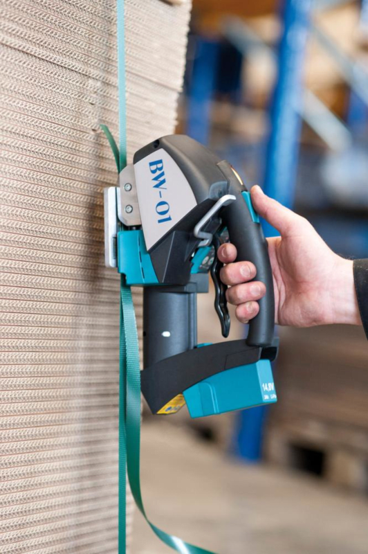 Akku-Umreifungsgerät, Typ BW-01 • Einfache Tastenprogrammierung • Spann-Verschluss: manuell/elektrisch • Akku: 14,8 V/2,0 Ah • Lebensdauer Akku: bis 2000 Ladungen • Ladegerät: 230 V/50 Hz • Bandtypen: PP-(Polypropylen-) und PET-(Polyester)-Bänder • Bandmaße: Breite: 12–16 mm, Dicke: 0,5–1,05 mm Lieferung: Umreifungsgerät, Akku und Ladegerät