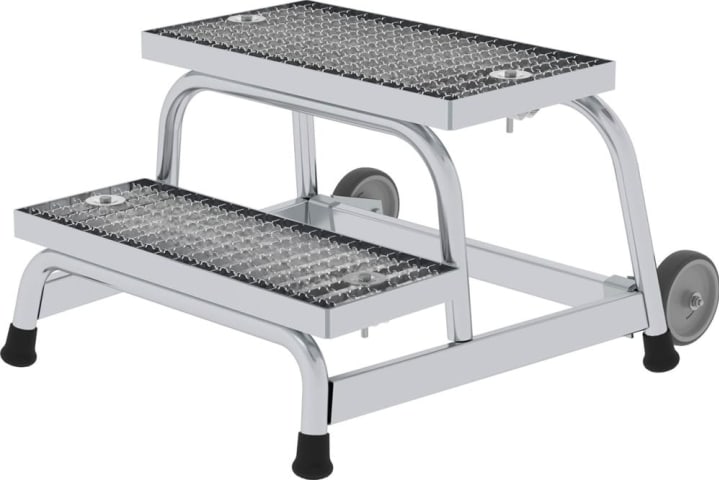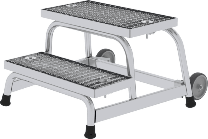 Arbeitspodest, einseitig begehbar, fahrbar • Rohrkonstruktion: aus Aluminium, verschweißt • Stufen: aus Stahl-Gitterrost • Holmenden: mit rutschfesten Kunststoffschuhen • Obere Standfläche: 550 x 300