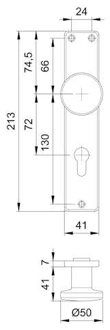 Knopfschild 1337/7203, außen, Langschild, Profilzylinder gelocht, Entfernung 72mm, DIN Links-Rechts, ohne Stütznocken, naturfarben eloxiert
