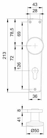 Knopfschild 1343/7203, außen, Langschild oval, Profilzylinder gelocht, Entfernung 72mm, DIN Links-Rechts, ohne Stütznocken, naturfarben eloxiert