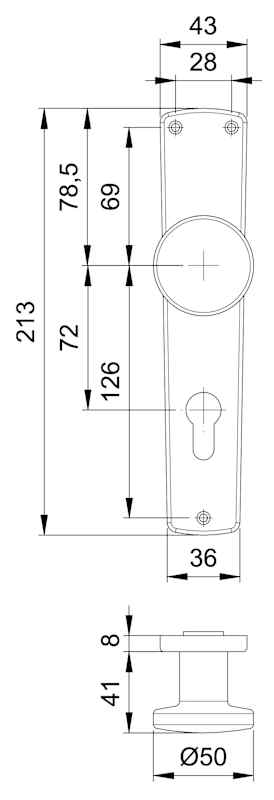 Knopfschild 1343/7203, außen, Langschild oval, Profilzylinder gelocht, Entfernung 72mm, DIN Links-Rechts, ohne Stütznocken, neusilberfarben eloxiert