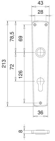 Langschild 1210, innen, konisch, ohne Stütznocken, Profilzylinder gelocht, Entfernung 72mm, Türstärke min. Türstärke 40- Türstärke max. 45mm, silber, naturfarben, eloxiert