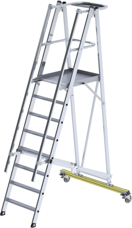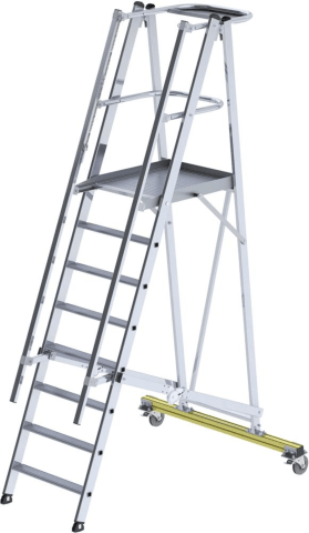 Aluminium-Podestleiter, fahrbar und klappbar • Standplattform: 650x600 mm aus geriffeltem Aluminium-Belag • 3-seitiges Plattformgeländer: beidseitiger Handlauf, praktische Ablageschale oben • Holme: aus stabilen Rechteckrohren • Stufen: dauerhaft verbördelt, geriffelt, 80 mm tief • Quertraverse: mit 2 feststellbaren Bockrollen, Ø 125 mm • Mit rutschsicheren nivello®-Leiterschuhen • Hohe Standsicherheit • Sicherungsseil: für ein sicheres Begehen und Stehen • Sicherheit: Bauart-geprüft, entsprechend Europäischer Norm DIN EN 131-7, Betriebssicherheitsverordnung (BetrSichV), TRBS 2121 und geltendem DGUV Regelwerk