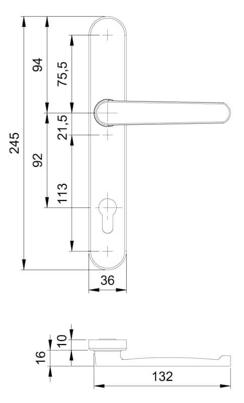 Halbgarnitur Kronos 0000/9235, innen, Langschild oval, Profilzylinder gelocht, Entfernung 92mm, Vierkant 8, DIN Links-Rechts, mit Stütznocken, verkehrsweiß beschichtet, festdrehbar