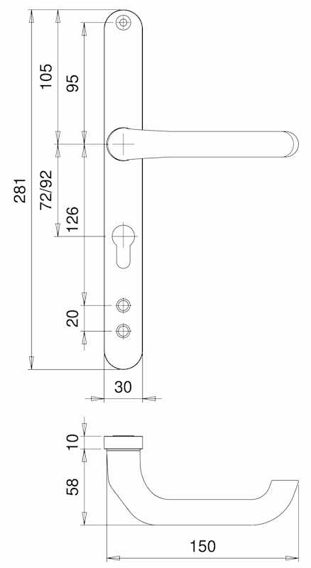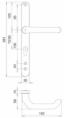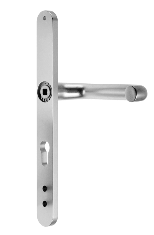 Halbgarnitur 1323/7203, innen, Langschild oval, Profilzylinder gelocht, Entfernung 72mm, Vierkant 8, DIN Links-Rechts, mit Stütznocken, naturfarben eloxiert, festdrehbar