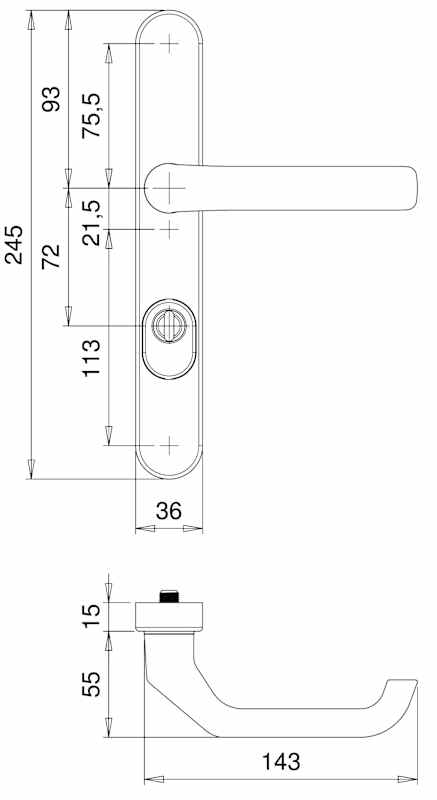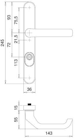 Rohrrahmen Sicherheits-Drückergarnitur Kronos 1200/0645,Langschild,mit Zylinderabdeckung 72/8,DIN Links-Rechts,naturfarben eloxiert,U-Form gekröpft/U-Form gekröpft