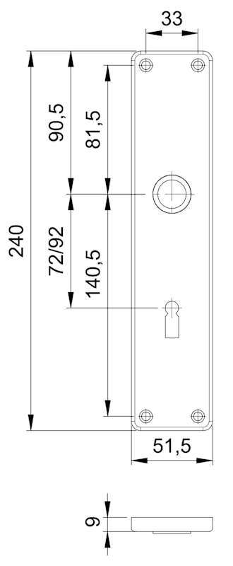 Langschild 2220, innen, eckig, ohne Stütznocken, Buntbart gelocht, Entfernung 92mm, Türstärke min. Türstärke 40- Türstärke max. 45mm, silber, naturfarben, eloxiert