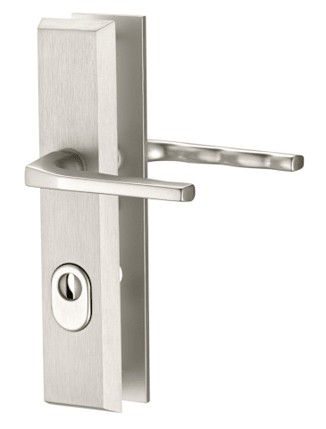 Vollblatt Sicherheits-Drückergarnitur Alpha 8747,Langschild,ES 1,mit Zylinderabdeckung 72/8,DIN Links-Rechts,neusilberfarben eloxiert,Türstärke35-45,Fingerform gekröpft/Fingerform gekröpft