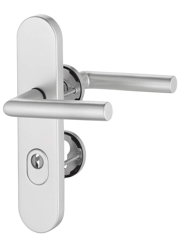 Schutz-Kombi-Drückergarnitur Metis 8742/7203, Langschild/Rosette, 15mm, ES 1, mit Zylinderabdeckung, Profilzylinder gelocht, Entfernung 72mm, Vierkant 8mm, TS 35 - 45mm, silber, naturfarben, eloxiert