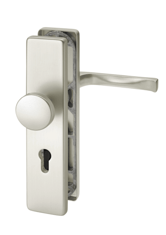 Vollblatt Sicherheits-Wechselgarnitur Juno 8750/0792,Langschild,ES 1,ohne Zylinderabdeckung 92/10,DIN Links-Rechts,neusilberfarben eloxiert,Türstärke65-75,rund/gekröpft fest