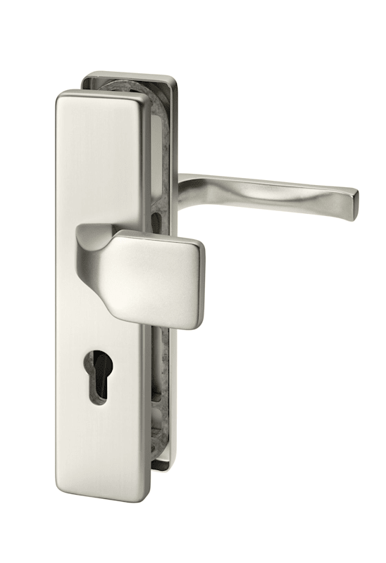 Vollblatt Sicherheits-Wechselgarnitur Juno 8750/0192,Langschild,ES 1,ohne Zylinderabdeckung 92/10,DIN Links-Rechts,neusilberfarben eloxiert,Türstärke65-75,eckig/gekröpft fest