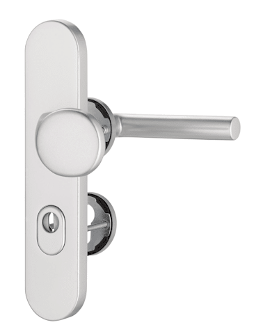 Schutz-Kombi-Wechselgarnitur Metis 8742/0272, Langschild/Rosette, 15mm, ES 1, mit Zylinderabdeckung, Profilzylinder gelocht, Entfernung 72mm, Vierkant 8mm, TS 35 - 45mm, silber, naturfarben, eloxiert