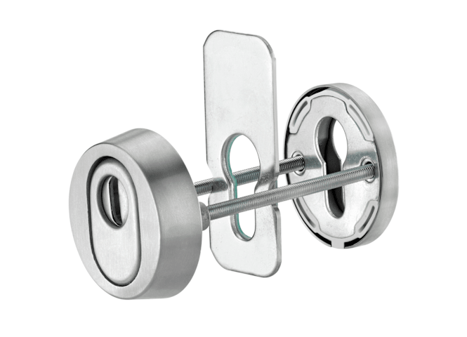 Schutzrosetten-Satz 7456, aufliegend, rund, 15mm, ES 1, mit Zylinderabdeckung/Profilzylinder gelocht, naturfarben eloxiert, Türstärke 65 - 70mm, Durchmesser Rosette (außen) 55mm