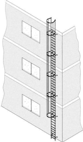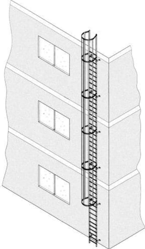 Steigleiter, einzügig, Aluminium eloxiert • Ortsfesten Montage: an Gebäuden zur Wartung nach DIN 18 799-1, oder als Notleiter-Anlage nach DIN 14 094-1 oder als Maschinenzustieg nach DIN EN ISO 14 122-4 • Mit Rückenschutzkorb, Ausstiegsholm, gerade, sowie Wandhalter, starr (Wandabstand 200 mm) • Leiterbreite: 520 mm • Wandhalter-Abstand untereinander: maximal 2,00 m. Jedoch muss jedes Leiterteil mit mindestens 2 Wandhaltern montiert werden Lieferung: Ohne Dübel und Schrauben für die Wandbefestigung. Hinweis: Steigleiterausführungen, die vom Standardangebot abweichen, auf Anfrage.