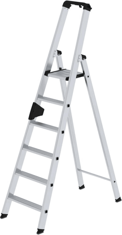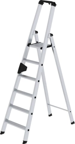 Stufen-Stehleiter, einseitig begehbar • Material: Aluminium • Hohe Standsicherheit: konische Bauweise, mit 6-fach vernieteten Leitern-Gelenk „safe-cap“ • Stufen-Holm-Verbindungen: dauehaft • Großflä