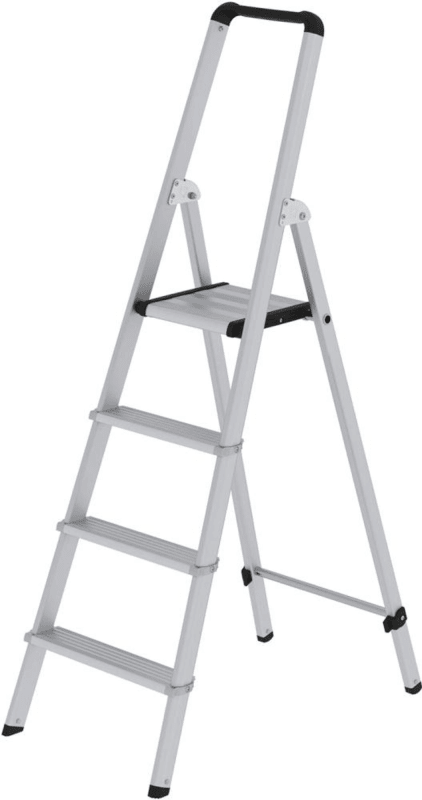 Stufen-Stehleiter ML, einseitig begehbar, eloxiert • Material: Aluminium, extrem abrieb- und kratzfest • Hohe Standsicherheit: konische Bauweise, mit 4-fach vernieteten Leitergelenken • Stufen-Holm-