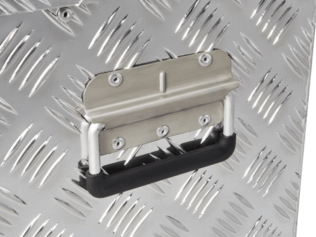 Alu-Riffelblech-Transportkiste • Rundum geschweißte Nähte • Korrosions-, witterungs- und temperaturbeständig • Material: 3-mm-Alu-Riffelblech • Edelstahl-Scharniere, Griffe und Verschlüsse • Standardmäßig massive Exzenterverschlüsse mit Öse für Vorhängeschlösser • Sicherheitshandgriffe: selbstklappend, kunststoffummantelt • Unterseite: inkl. 4 Füße mit Innengewinde M10 für fixe Befestigung • Inhalt staub- und spritzwassergeschützt durch umlaufende Gummidichtung