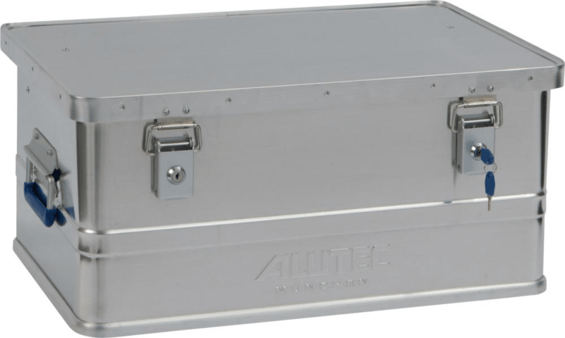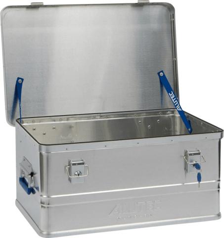 Aluminiumbox, Serie CLASSIC • Transport- und Aufbewahrungsbehälter • Leicht und stabil • Mit Stoßsicherung und formbeständig • Verstärkt durch umlaufende, profilierte Sicken • Korrosions-, witterungs- und temperaturbeständig • Platzsparend stapelbar • Zwei Fangbänder am Klappdeckel verhindern ein Ausreißen der Scharniere • Stabile Klapphebelverschlüsse mit 2 Zylinderschlössern • Mit Bohrungen für Vorhängeschloss oder Plombenverschluss • Staub- und spritzwassergeschützt mit auswechselbarer, langlebiger Gummidichtung im Kastenprofil • Ergonomische, selbsteinklappende Sicherheitstragegriffe mit Kunststoffummantelung