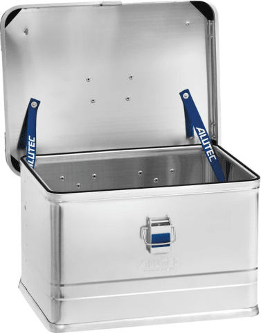 Aluminiumbox, Serie INDUSTRY • Transport- und Aufbewahrungsbehälter • Mit robusten und groß dimensionierten Aluminiumprofilen • Mit Stoßsicherung und formbeständig • Korrosions-, witterungs- und temperaturbeständig • Zwei Fangbänder am Klappdeckel verhindern ein Ausreißen der Scharniere • Stabile Klapphebelverschlüsse • Mit Bohrungen für Vorhängeschloss oder Plombenverschluss • Staub- und spritzwassergeschützt mit auswechselbarer, langlebiger Gummidichtung im Kastenprofil • Ergonomische, selbsteinklappende Sicherheitstragegriffe mit Kunststoffummantelung • Mit extrem robusten Alu-Gussecken
