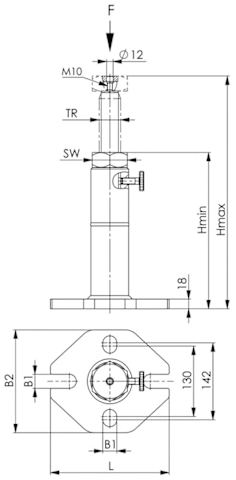 Schraubbock, schwer• Vergütungsstahl mit Trapezgewinde • Spindelkopf brüniert • Grundkörper aus Vergütungsstahl, mit Endsicherung • Zentrierloch-Ø 12 mm • Spindelkopf in runder Ausführung