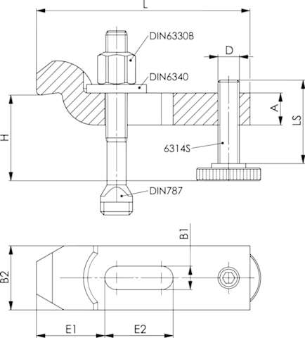 Spanneisen, gekröpft, mit verstellbarer Stützschraube• Aus Vergütungsstahl, lackiert Lieferung: Mit Schrauben für T-Nuten DIN 787, Mutter und Scheibe.