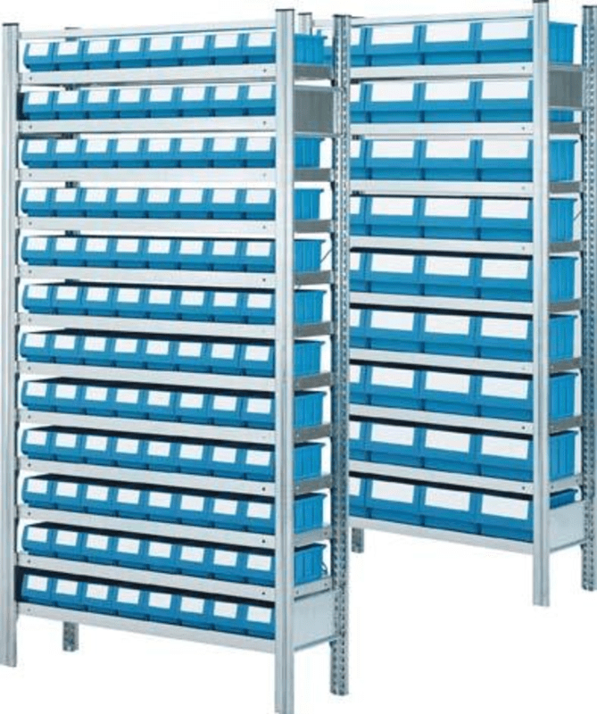 Komplettregal mit Kunststoff-Regalkästen (Anbauregal) • Mit Rohrverstärkung in Längsrichtung • Breitenriegel als oberer Abschluss statt Fachboden • Material: Stahlblech • Oberfläche: verzinkt • Feldlast: bis 1400 kg • Fachlast: bis 140 kg • Aussteifung: durch Kreuzstreben • Kantenhöhe Fachböden: 40 mm Hinweis: Ohne Werkzeug, schnell und einfach durch vormontierte Seitenrahmen aufgestellt. Optional können die Regalkästen mit Sicherungsbügeln gegen Herabfallen gesichert werden. Gesamtbreite: Anbaufeld = Breite + 5 mm Gesamttiefe: Anbaufeld = Tiefe + 25 mm Hinweis: Passende Einsatzkästen ebenfalls erhältlich.