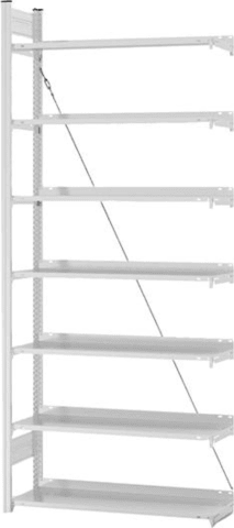 Büro-Steckregal, RAL 7035 lichtgrau • Oberfläche Böden/Rahmen:RAL 7035 lichtgrau • Fachlast: 60 kg • Raster Höhenverstellung: 25 mm Abstand • Aussteifung: Diagonalstreben • Bodenkante: 25 mm hoch • Schnelle Steckmontage: nachträglich beliebig erweiterbar • Einseitig nutzbar Planungshinweis: Grundregal: 810/1060 mm. Anbauregal: 760/1010 mm. Bodentiefe: 335 mm. Sicherheitshinweis: Regale mit einem Höhen-Tiefenverhältnis von größer als 5 : 1 müssen gegen Kippen gesichert werden (Wand- oder Deckenverankerung)