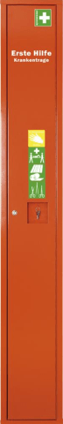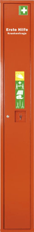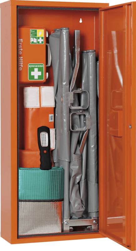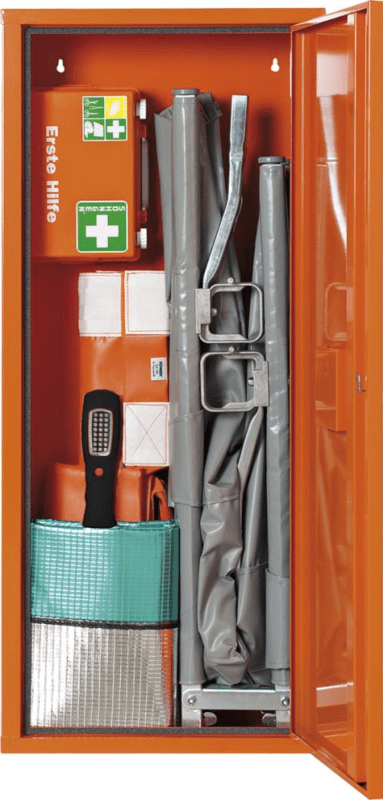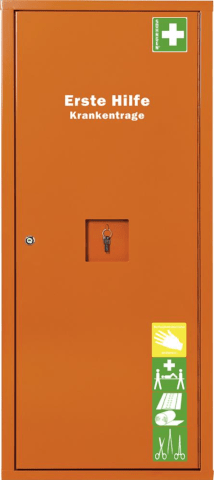 Erste-Hilfe-Schrank »Safe-System« Ausführung: • Sicherheits-Zylinderschloss • Notschlüsselfach in Türmitte Material: kaltgewalztes Qualitäts-Feinblech Farbe: orange Inhalt: • Krankentrage • Söhngen®-