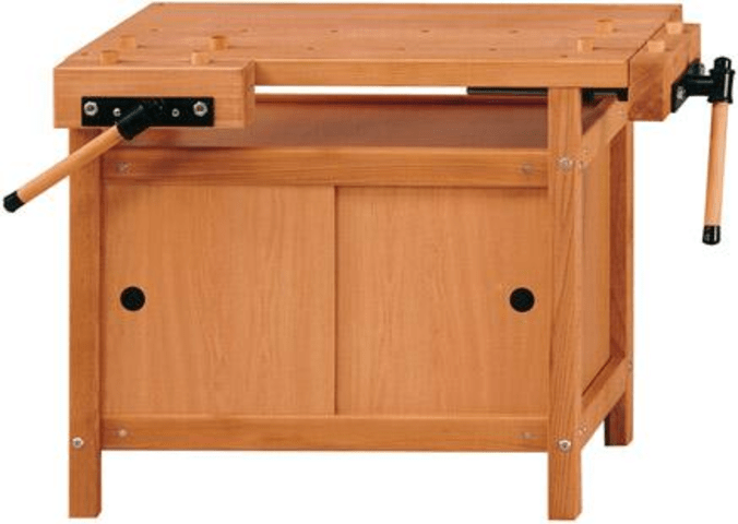 Hinweis: Praktisches Schränkchen mit Schiebetüren unter der Hobelbankplatte.