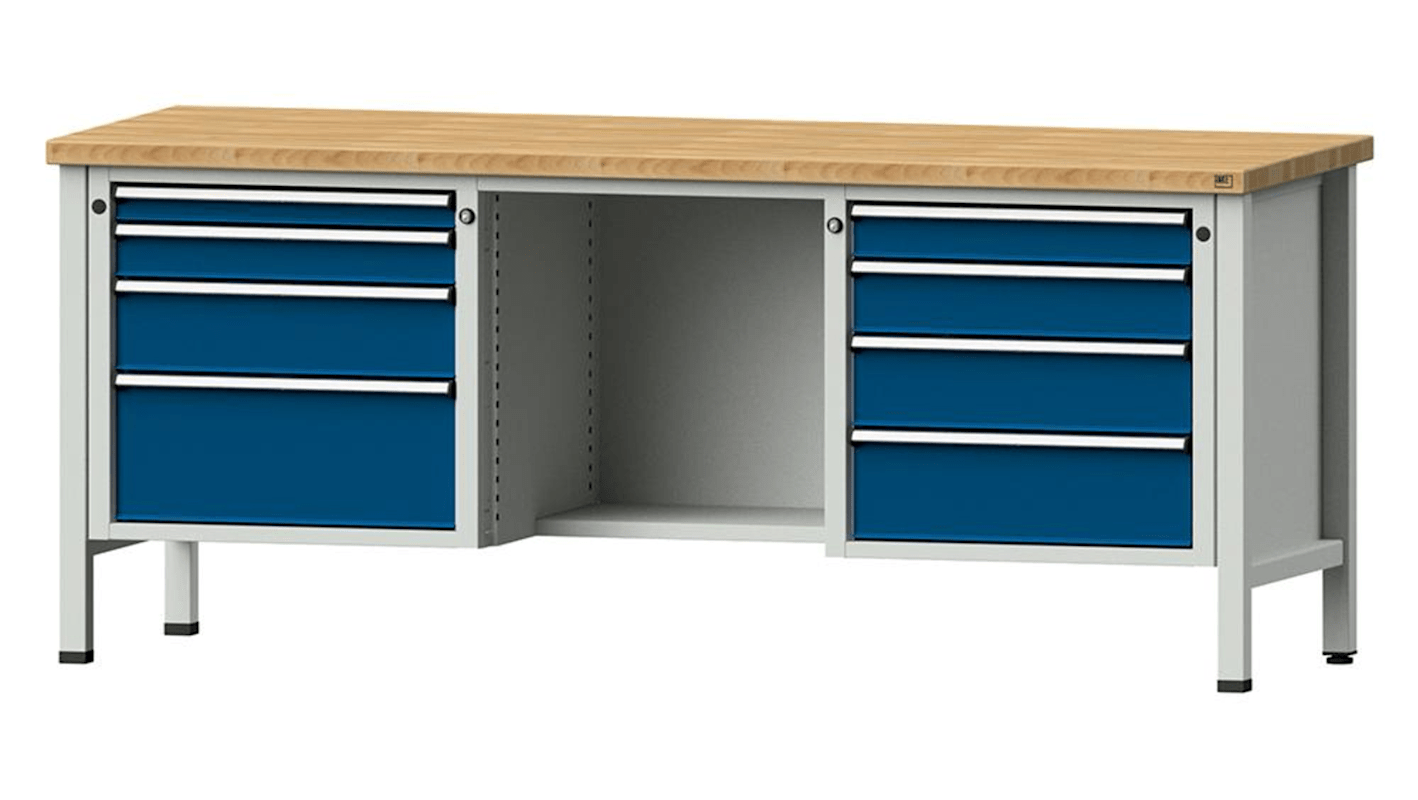 Kastenwerkbank Serie V (Modelle 7 bis 12), Breite 2000 mm- Werkbankplatte aus Buche massiv, längsseits riegelartig zahnverleimt, Oberfläche geölt - Plattenstärken: 40, 50 mm- Verschiedene Längen in 800, 1500, 2000, 2800 mm- Traglast: 1500 kg- Zentralverschluss- Verschweißte Fußrahmen aus Vierkant-Stahlrohr, 45/45/2 mm- 11 Schubladenfronthöhen im 30-mm-Raster von 60 bis 360 mm, Vollauszug 100 %, serienmäßig mit Einzelauszugsperre- Innenabmessungen B x T: 500 x 540 mm - 100 kg Traglast der Schubladen- Fronthöhe 540 mm der Türen- Mit 1 Niveauausgleich- Lieferung montiert- Farbe: Fronten RAL 5010 enzianblau, Gestell/Gehäuse RAL 7035 lichtgrauWeitere Farben in Ein- oder Zweifarblackierung ohne Aufpreis lieferbar (siehe Farbleiste)Ausführung:- Links: 1 x Schublade 60 mm, 1 x Schublade 90 mm, 1 x Schublade 150 mm, 1 x Schublade 240 mm- Mitte: offen- Rechts: 1 x Schublade 90 mm, 1 x Schublade 120 mm, 1 x Schublade 150 mm, 1 x Schublade 180 mm