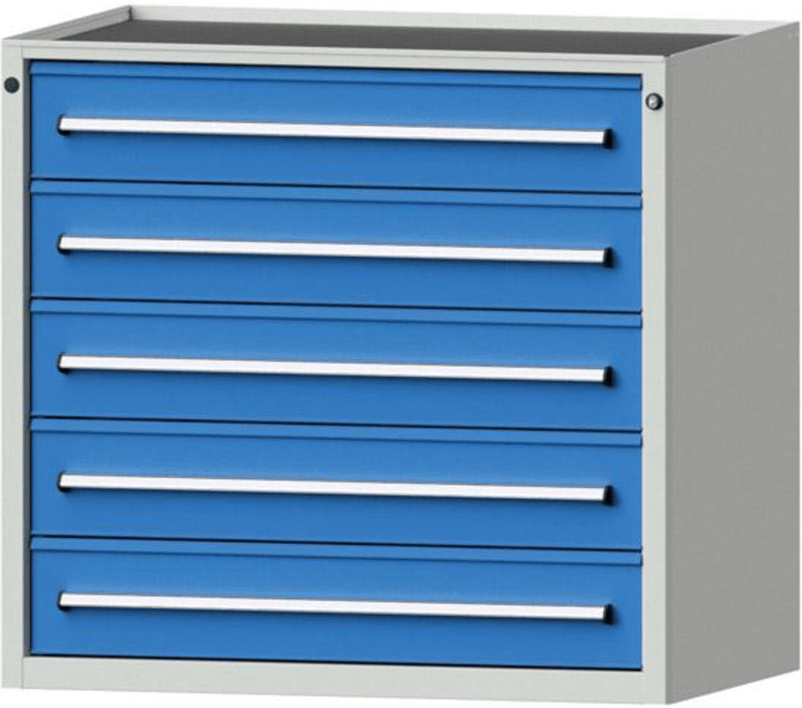 Schubladenschrank Serie V, Höhe 980 mm• Wanne: mit Antirutschmatte • Schubladen: mit Vollauszug und Einzelauszugsperre • Oberfläche: Gehäuse RAL 7035 lichtgrau/Schubladenfronten RAL 5010 enzianblau