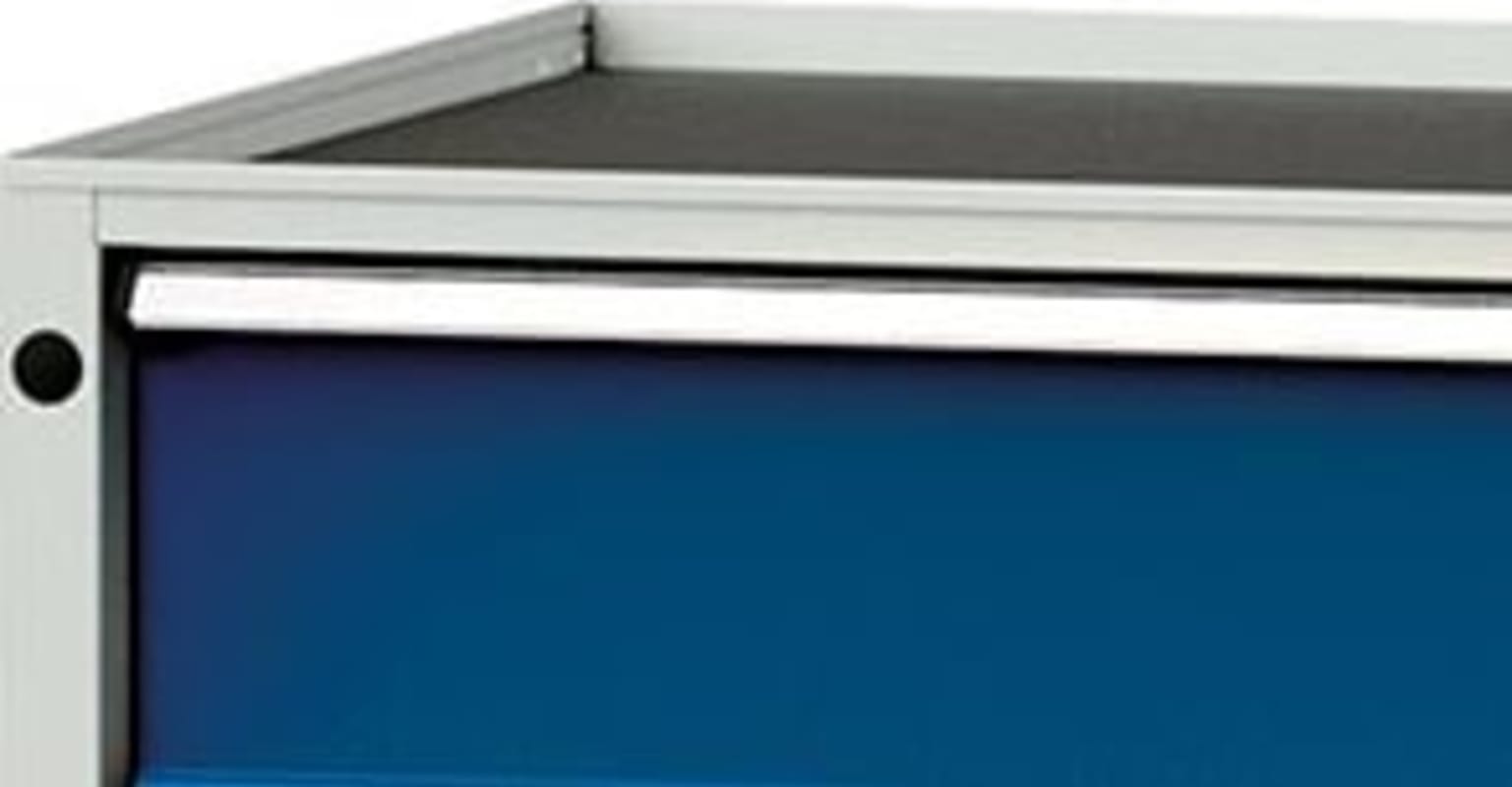 Schubladenschrank Serie V, Höhe 980 mm• Wanne: mit Antirutschmatte • Schubladen: mit Vollauszug und Einzelauszugsperre • Oberfläche: Gehäuse RAL 7035 lichtgrau/Schubladenfronten RAL 5010 enzianblau