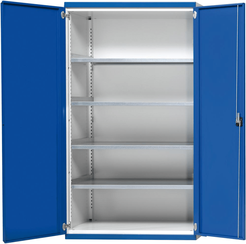 Schwerlastschrank, Breite 1085 mm• Gehäuse: Stahlblech • Türen: mit 3-Riegel-Sicherheitszylinderschloss • Türenöffnungswinkel: 270° • Lackierung: Gehäuse RAL 7035 lichtgrau, Fronten RAL 5010 enzian