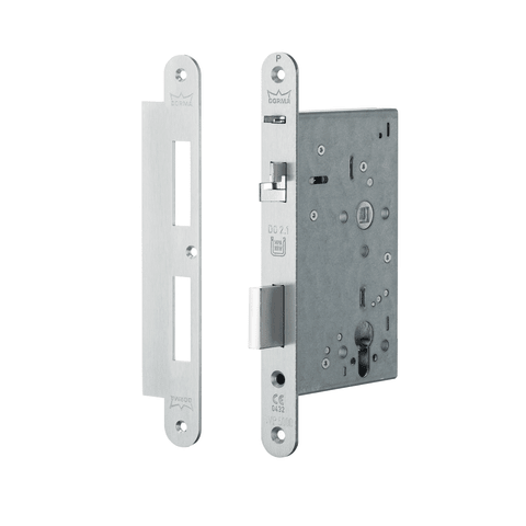 Selbstverriegelndes Antipanikschloss mit mechanischer Ablaufsicherung. Zweipunktverriegelung durch Federvorspannung nach Türschließung. Dreistufige Riegelsicherung. Universal-Steuerfalle (24-mm-Stulp-Varianten DIN L/R verwendbar), Panikentriegelung über Drücker, Wechsel zur Entriegelung über Schlüssel von außen. Stahlriegel 20 mm ausschließend. 9 mm Vierkantnuss. Korrosionsgeschützter Schlosskasten in DIN-Abmessungen, Stulp und zum Lieferumfang gehörendes Schließblech aus Edelstahl.