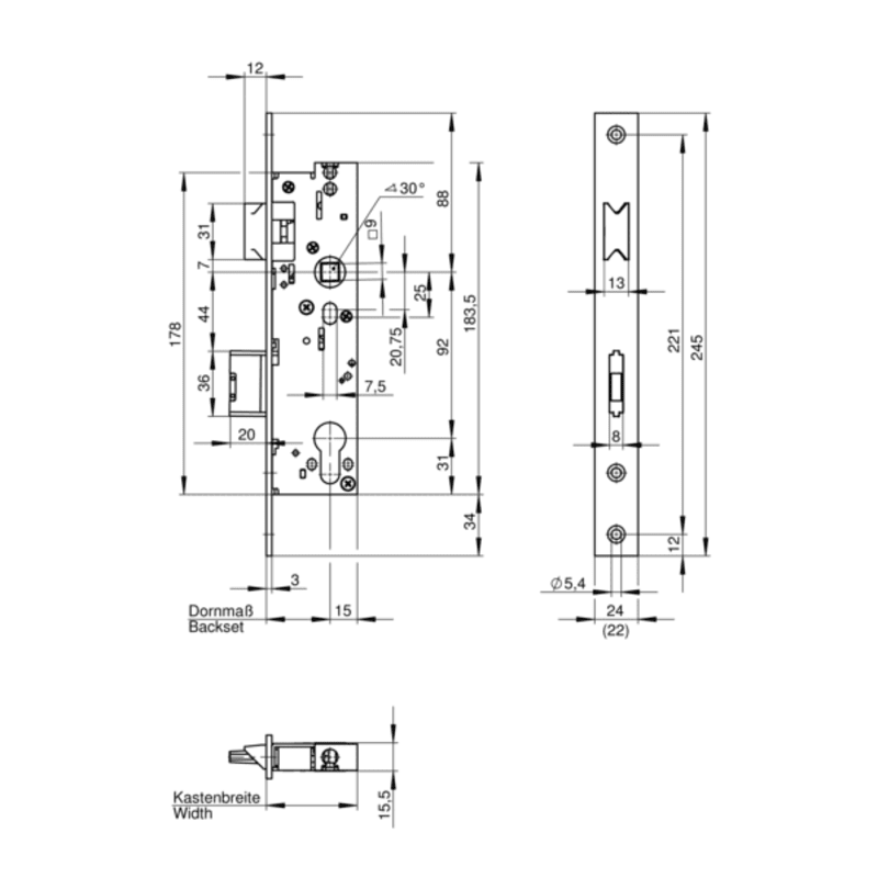 Kastenbreite Dornmaß + 15 mm