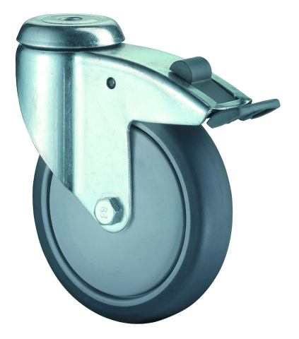 Eigenschaften Lenkrolle mit Totalfeststeller: • Gabel aus Stahlblech • verzinkt-chromatiert • zweireihiger Kugelkranz im Gabelkopf • Lauffläche: Gummi grau • Radkörper: Kunstoff • Kugellager (80, 150, 200 mm Ø mit Metallfadenschutz) Technische Daten: • Rückenlochdurchmesser: 12,2 mm
