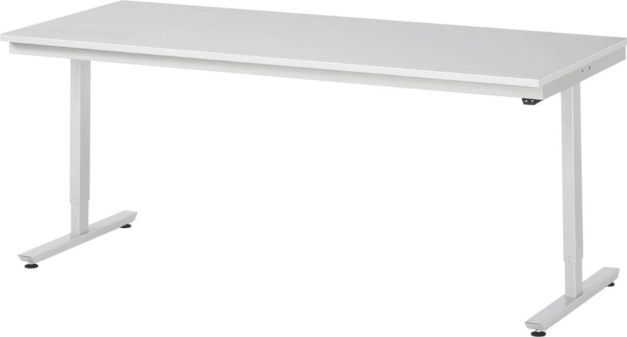 Arbeitstisch, Serie adlatus 150, Melamin-Platte • Mit Melamin-Platte: Stärke: 22 mm • Flächenlast: max. 150 kg • Funktionsunterbau: mit Hubsäulen (Prüfung gem. EN 60335-1) inklusive Steuereinheit, Anschlusskabel und Bedienelement mit Auf-/Ab-Taster • Verstellweg: 38 mm/s (ohne Zuladung) • Einschaltdauer: 10 % (6 Minuten pro Stunde oder 2 Minuten Dauerbetrieb bei Volllast) • Stromverbrauch im Standby-Modus: nur 0,1 W • Kompletter Rahmen: zur Aufnahme der Arbeitsplatte • Kufen: mit Nivellierfüßen • Umweltfreundliche Pulverbeschichtung: RAL 7035 lichtgrau Lieferung: Erfolgt komplett montiert.