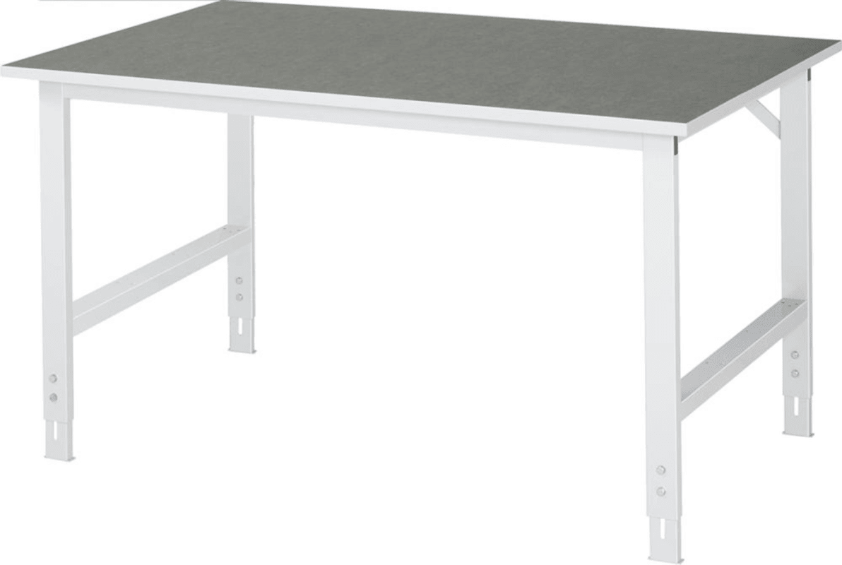 Arbeitstisch, Serie Tom, Linoleum-Platte • Linoleum-Platte: Oberseite mit einem 2,0 mm starken, hellgrau marmorierten Linoleum-Belag, permanent antistatisch, fungizid, bakteriostatisch, schwer entflammbar, temperaturbeständig, verschleißfest, druckfest • Stärke: 25 mm • Arbeitshöhe: von 760 bis 1080 mm einstellbar • Flächenlast: max. 500 kg • Stabiler Funktionsunterbau: Profil-Stahlrohr mit Fußelementen (60x30 mm), Querstreben (50x25 mm) und Aussteifungstraversen • Umweltfreundliche Pulverbeschichtung: RAL 7035 lichtgrau Lieferung: zerlegt, einfache Montage.