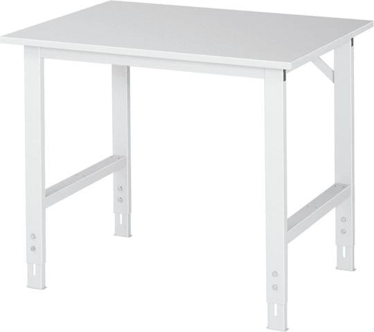 Arbeitstisch, Serie Tom, ESD-Melamin-Platte • ESD-Melamin-Platte: Ober- und Unterseite mit einer leitfähigen, lichtgrauen Melaminharz-Direktbeschichtung (nach DIN 68765), volumenleitfähige Mittellage, normaler Abriebwiderstand, bedingte Kratz- und Stoßfestigkeit • Stärke: 28 mm • Arbeitshöhe: von 760 bis 1080 mm einstellbar • Flächenlast: max. 500 kg • Stabiler Funktionsunterbau: Profil-Stahlrohr mit Fußelementen (60 x 30 mm), Querstreben (50 x 25 mm) und Aussteifungstraversen • Umweltfreundliche Pulverbeschichtung: RAL 7035 lichtgrau Lieferung: zerlegt, einfache Montage.