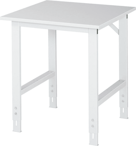 Arbeitstisch, Serie Tom, ESD-Melamin-Platte • ESD-Melamin-Platte: Ober- und Unterseite mit einer leitfähigen, lichtgrauen Melaminharz-Direktbeschichtung (nach DIN 68765), volumenleitfähige Mittellage, normaler Abriebwiderstand, bedingte Kratz- und Stoßfestigkeit • Stärke: 28 mm • Arbeitshöhe: von 760 bis 1080 mm einstellbar • Flächenlast: max. 500 kg • Stabiler Funktionsunterbau: Profil-Stahlrohr mit Fußelementen (60 x 30 mm), Querstreben (50 x 25 mm) und Aussteifungstraversen • Umweltfreundliche Pulverbeschichtung: RAL 7035 lichtgrau Lieferung: zerlegt, einfache Montage.