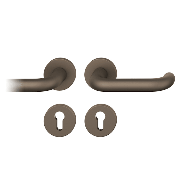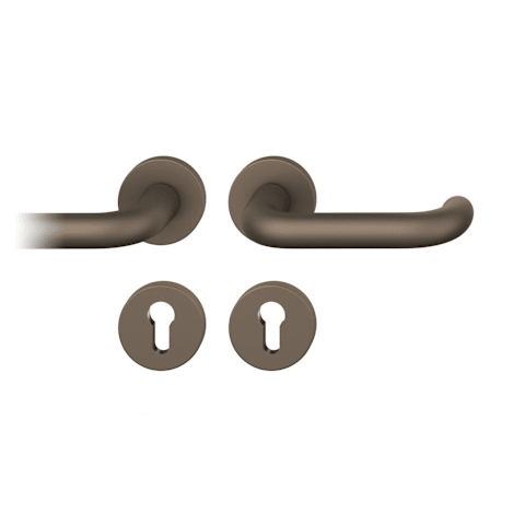 FSB Drückergarnitur 12 1146; Produkttyp: Drückergarnitur; Produkttyp (Hersteller): Drückergarnitur; Ausführung: Rosette; Befestigungsart Drückerrosette (außen): verdeckt verschraubt; Befestigungsart Drückerrosette (innen): verdeckt verschraubt; Befestigungsart Schlüsselrosette (außen): verdeckt verschraubt; Befestigungsart Schlüsselrosette (innen): verdeckt verschraubt; Befestigungstechnik: mit Stütznocken; Montageart: aufliegend; Form Drückerrosette: rund; Form Schlüsselrosette (außen): rund; Form Schlüsselrosette (innen): rund; Vierkant: 8 mm; Material: Aluminium; Material Unterkonstruktion (Griffrosette): Kunststoff-Edelstahlverbundbau; Form Türgriff (innen): U-Form; Form Türgriff (außen): U-Form; Durchmesser Türgriff (innen): 20 mm; Durchmesser Türgriff (außen): 20 mm; Durchmesser Schlüsselrosette: 55 mm; Länge Türgriff (innen): 142 mm; Länge Türgriff (außen): 142 mm; Höhe Türgriff (innen): 63 mm; Höhe Türgriff (außen): 63 mm; Durchmesser Drückerrosette (außen): 55 mm; Durchmesser Drückerrosette (innen): 55 mm; Höhe Drückerrosette (außen): 7 mm; Höhe Drückerrosette (innen): 7 mm; Höhe Schlüsselrosette (außen): 7 mm; Höhe Schlüsselrosette (innen): 7 mm; Lagerung: festdrehbar,mit Rückholfeder,Adapter-Standardlager; Einsatzbereich: Objekttür; Türart: Vollblatt; Türwerkstoff: Stahl,Holz; Lochung: Profilzylinder gelocht; DIN-Richtung: DIN Links-Rechts; Farbe: braun; Farbton: mittelbronzefarben; Oberfläche: gestrahlt,eloxiert; Ausführung Vierkant: Stabilstift; Betätigungswinkel max.: 45 °; Türstärke min.: 39 mm; Türstärke max.: 58 mm; Norm: DIN EN 1906; EN 1906 - Gebrauchskategorie: Klasse 4; EN 1906 - Dauerhaftigkeit: Klasse 7; EN 1906 - Türmasse: -; EN 1906 - Feuerbeständigkeit: Klasse 0; EN 1906 - Sicherheit: Klasse 1; EN 1906 - Korrosionsbeständigkeit: Klasse 5; EN 1906 - Einbruchschutz: Klasse 0; EN 1906 - Ausführungsart: Typ A; Klassifizierungsschlüssel EN 1906: 47-0150A